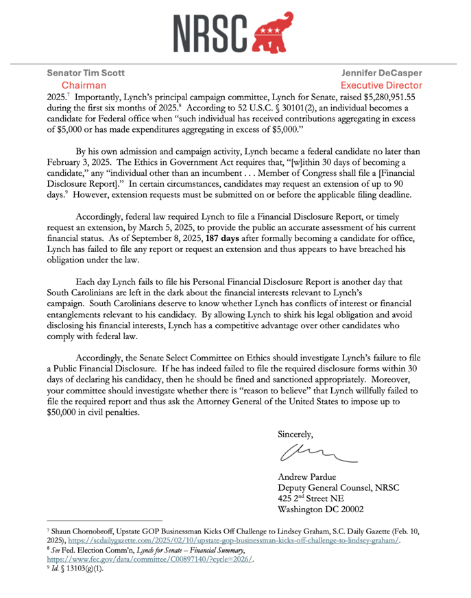 The National Republican Senatorial Committee is calling for an investigation into Senate candidate Mark Lynch (R-SC) by the Senate Select Committee on Ethics for failing to timely file his Personal Financial Disclosure Form. Lynch has not filed a report or requested an extension since he became a candidate over 180 days ago.