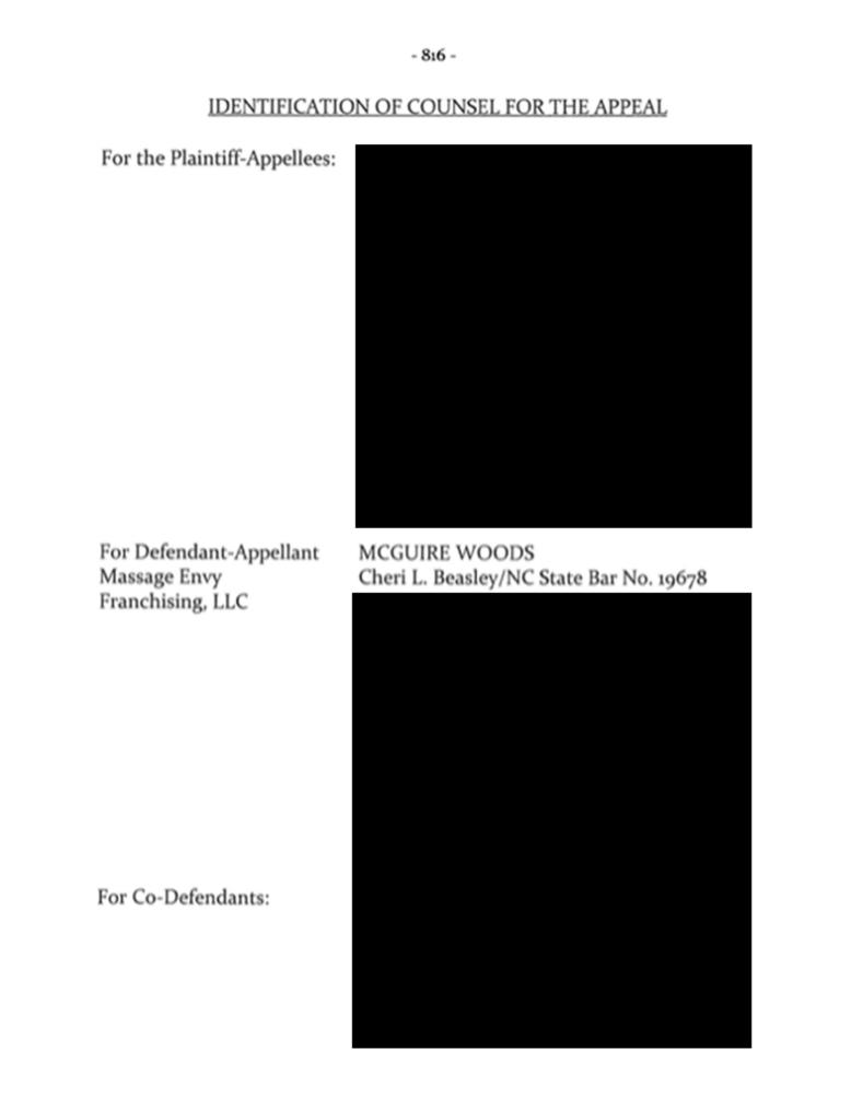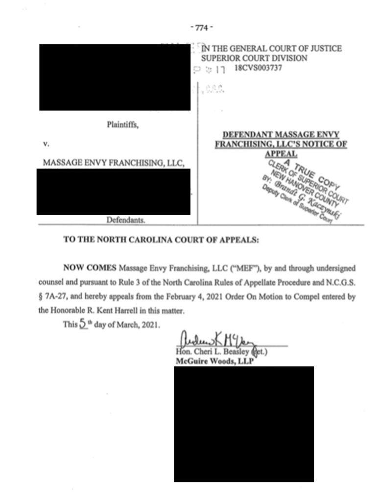 On March 5, 2021, Massage Envy Filed An Appeal In A Lawsuit Related To Sexual Abuse In Their Massage Parlors. Cheri Beasley Is Listed As Counsel For Massage Envy.