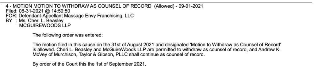 On August 31, 2021, Beasley Filed A Motion To Withdraw As The Counsel Of Record For Massage Envy.