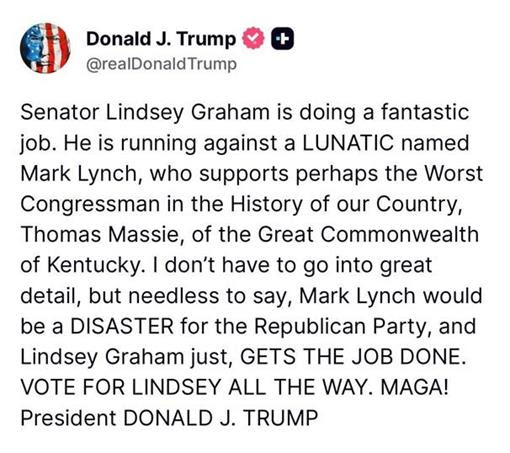 “Lindsey Graham has delivered President Trump’s agenda in the U.S. Senate and always puts South Carolinians first, which is why Graham is the only candidate in this race with the President’s full backing,” said NRSC Regional Press Secretary Nick Puglia.