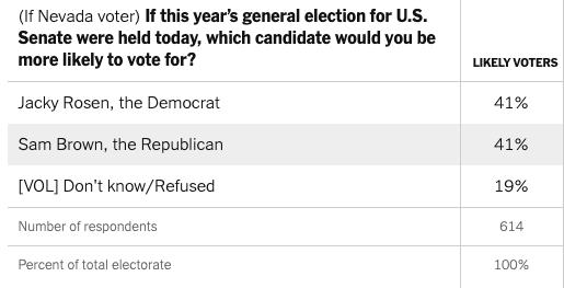 New polling of likely voters conducted by the New York Times and Siena College found Sam Brown and Jacky Rosen are tied at 41%.