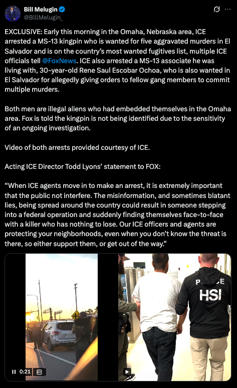 “Dan Osborn bragged about not voting for President Trump in 2024, but without Nebraskans electing Trump, an MS-13 kingpin wanted for five murders would still be roaming free in Nebraska,” said NRSC Communications Director Joanna Rodriguez. “Osborn’s vote against President Trump tells you what world he wants: the one where violent criminals cross our border to embed themselves in communities just like this killer did in Omaha, Nebraska.”