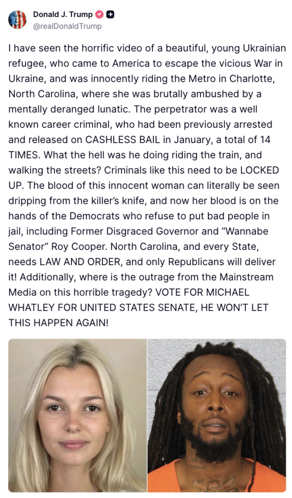 President Donald J. Trump slammed failed Governor Roy Cooper’s soft-on-crime agenda that led to the tragic murder of Ukrainian refugee, Iryna Zarutska, by a career criminal in North Carolina.