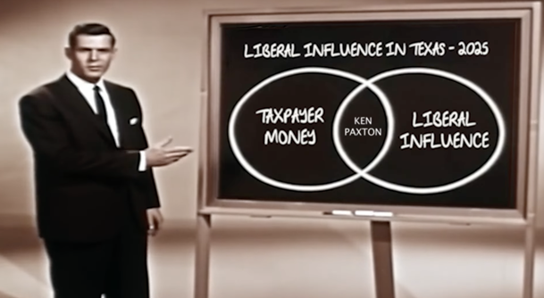 Male Voice Over 1: “Under Attorney General Ken Paxton, state contracts and grants have quietly connected your tax dollars to liberal organizations.