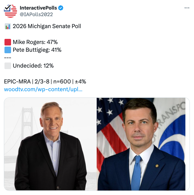 “Pothole Pete went from mediocre Indiana Mayor to far-left presidential candidate to the worst-ever Transportation Secretary under an unpopular President,” said NRSC Regional Press Secretary Nick Puglia. “This poll makes it very clear that Michiganders aren’t interested in helping Pete carpetbag his way into adding Senator from Michigan to his resume.”