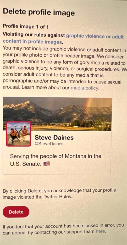 The company claims Chairman Daines violated their policies against “graphic violence” because “his profile pic showed him hunting with his wife.”